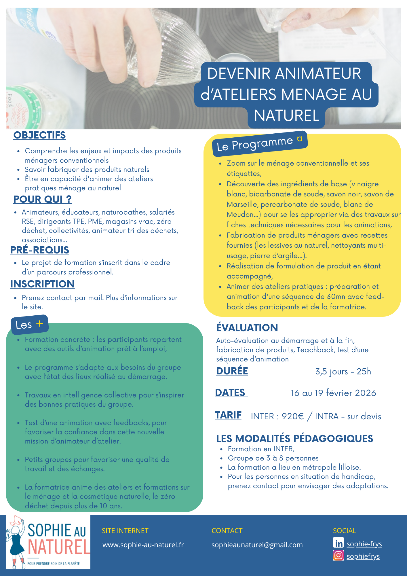 NOTE DE SOPHIE » La demande d’allonger la formation ménage au naturel a été entendue : en 2022, elle passe de 21h, à 25h, pour permettre de travailler plus d’ingrédients du ménage au naturel, de travailler les formulations, la préparation de l’animation d’atelier, mais surtout, pour apporter plus de confort afin d’assimiler le contenu, très dense ». Démarrage de la nouvelle formule en octobre 2022.